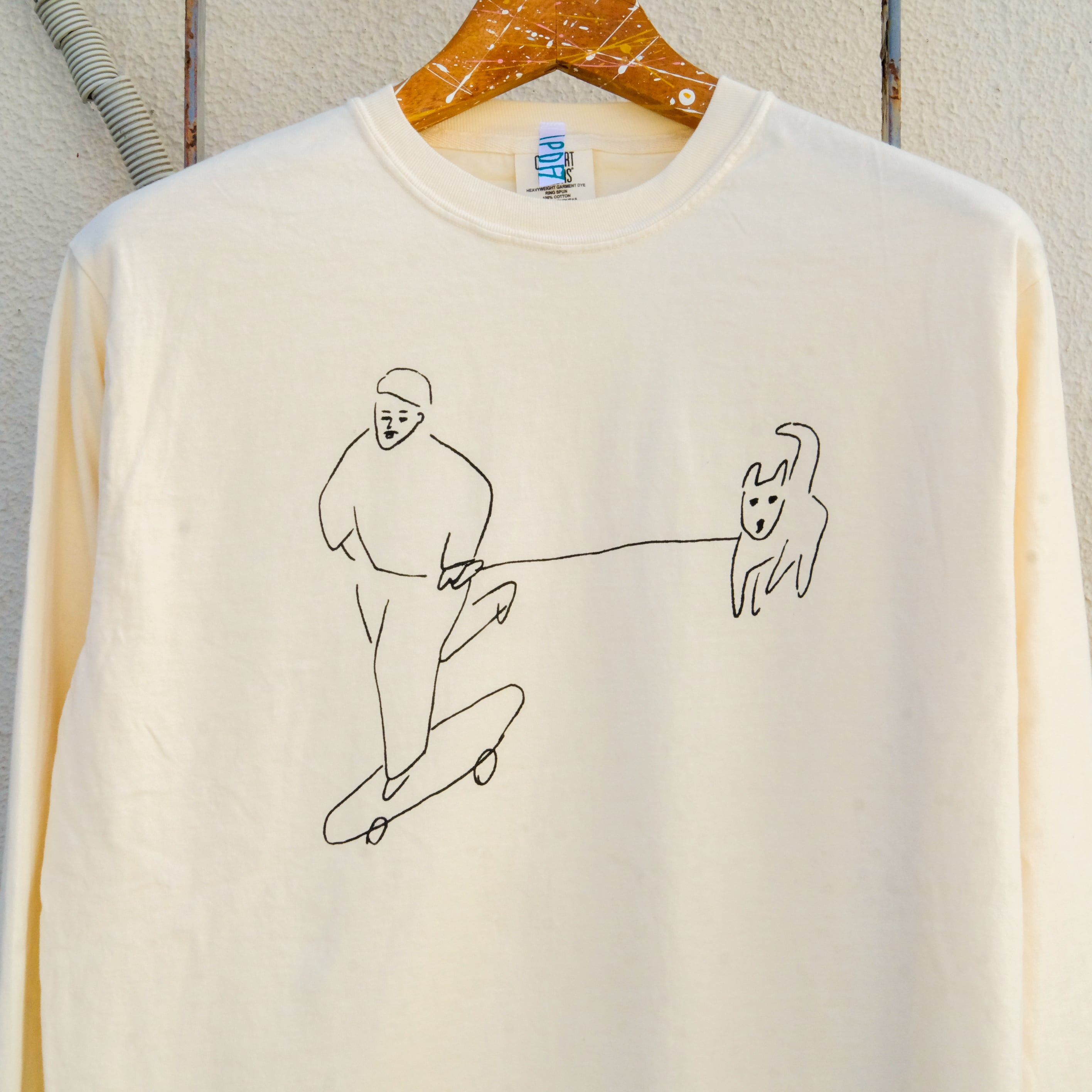 フロントには、スケボーに乗って犬を散歩するユニークなイラストが描かれており、見る人に明るい気持ちを与えてくれます。