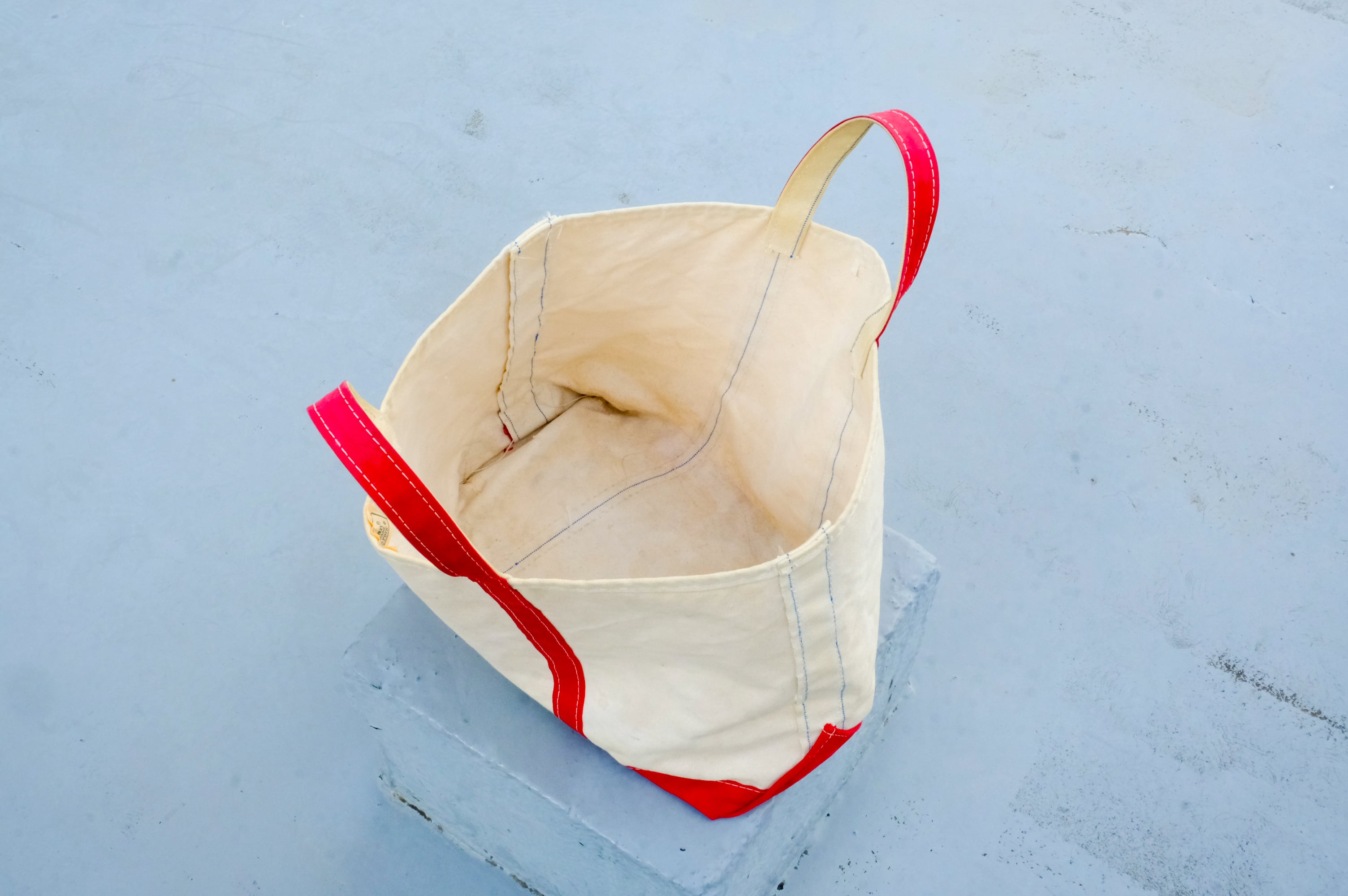 肉厚な生成りキャンバスに、発色のいいレッドのボトム&ハンドル。